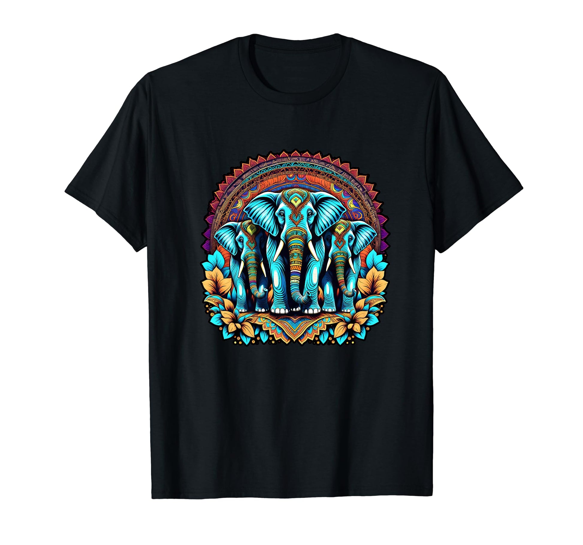 - Dynamic Design: Features a trio of elephants adorned in vibrant psychedelic patterns, marching forward with strength and unity, creating a captivating visual impact.